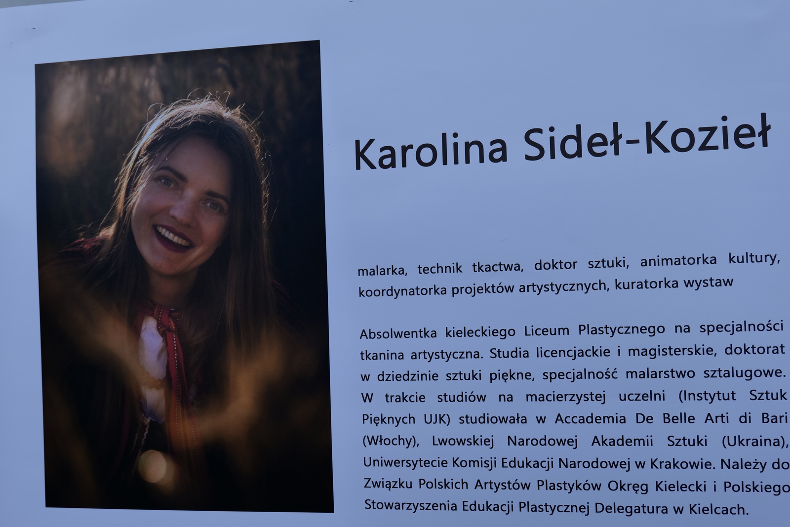 Karolina Sideł-Kozieł to absolwentka kieleckiego Liceum Plastycznego na specjalności tkanina artystyczna. Studia licencjackie i magisterskie, doktorat w dziedzinie sztuki piękne, specjalność malarstwo sztalugowe. W trakcie studiów na macierzystej uczelni (Instytut Sztuk Pięknych UJK) studiowała w Accademia De Belle Arti di Bari (Włochy), Lwowskiej Narodowej Akademii Sztuki (Ukraina), Uniwersytecie Komisji Edukacji Narodowej w Krakowie. Należy do Związku Polskich Artystów Plastyków Okręg Kielecki i Polskiego Stowarzyszenia Edukacji Plastycznej Delegatura w Kielcach. Nagrody: Scyzoryk 2013, Nagroda w Ogólnopolskim Przeglądzie Fotograficznym „Ponidzie” 2018, Świętokrzyska Nagroda Kultury 2020. Stypendia: stypendium naukowe Międzynarodowego Funduszu Wyszehradzkiego (2016), stypendium twórcze Ministra Kultury i Dziedzictwa Narodowego (2020), stypendium „Mistrz i uczeń” Narodowy Instytut Kultury i Dziedzictwa Wsi (2024), stypendium „KPO dla kultury” Narodowy Instytut Muzyki i Tańca (2024).